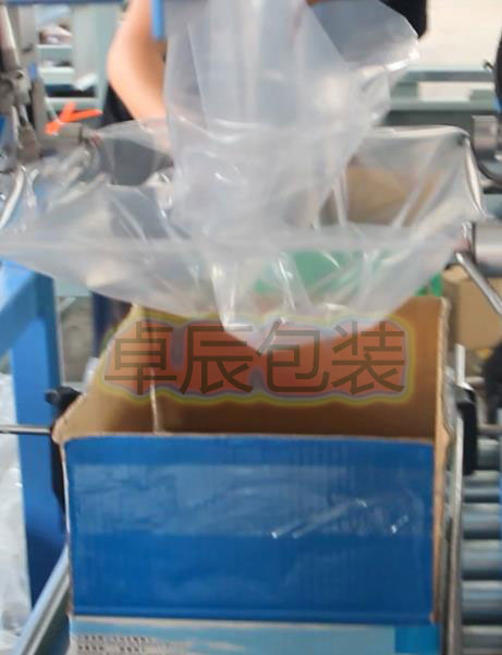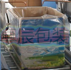 功能:在封好底部的紙箱上套上第二層塑料袋,不需要人工套袋,就可以完成自動。提高生產線的工作效率。